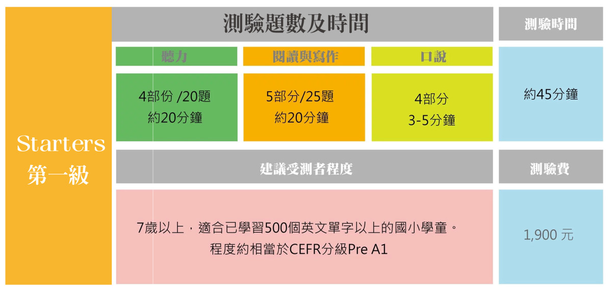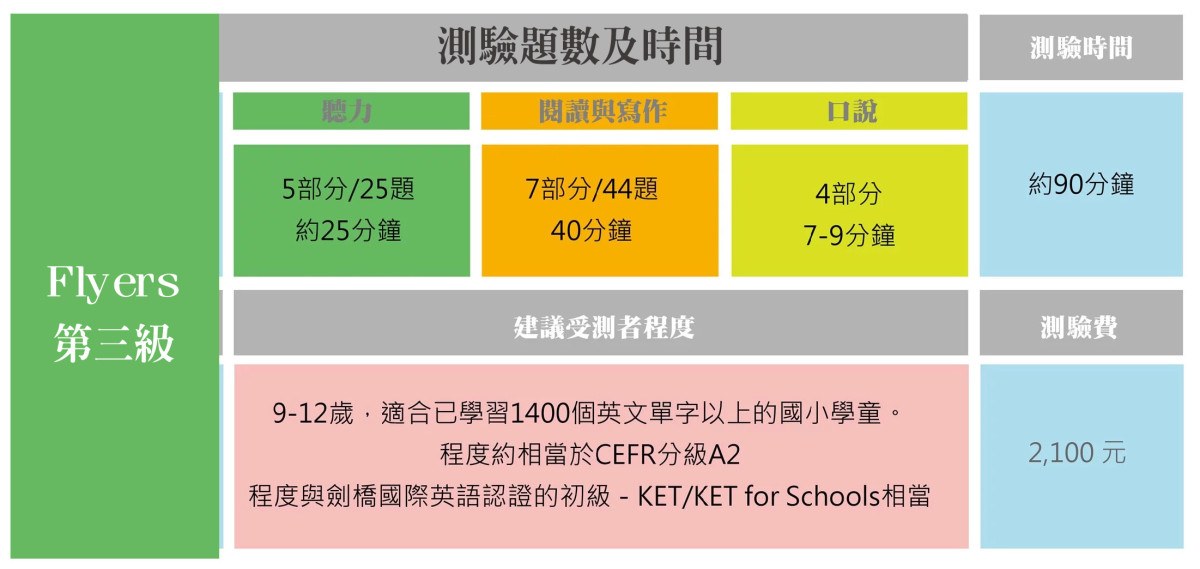 劍橋兒童英語認證(YLE),係由「英國劍橋大學語言測評考試院」 (Cambridge Assessment English) 所研發,是專為國中以下學童所設計研發的國際認證測驗,全球每年超過55個國家共計310,000人次參加本測驗。測驗分三個級數:Starters、Movers、Flyers,試題生動活潑並以彩色印刷,口說測驗特別採主考與應試者面對面的直接溝通方式進行,讓學童在自然輕鬆的情境下完成測驗,全程應試者可獲頒成績證書。